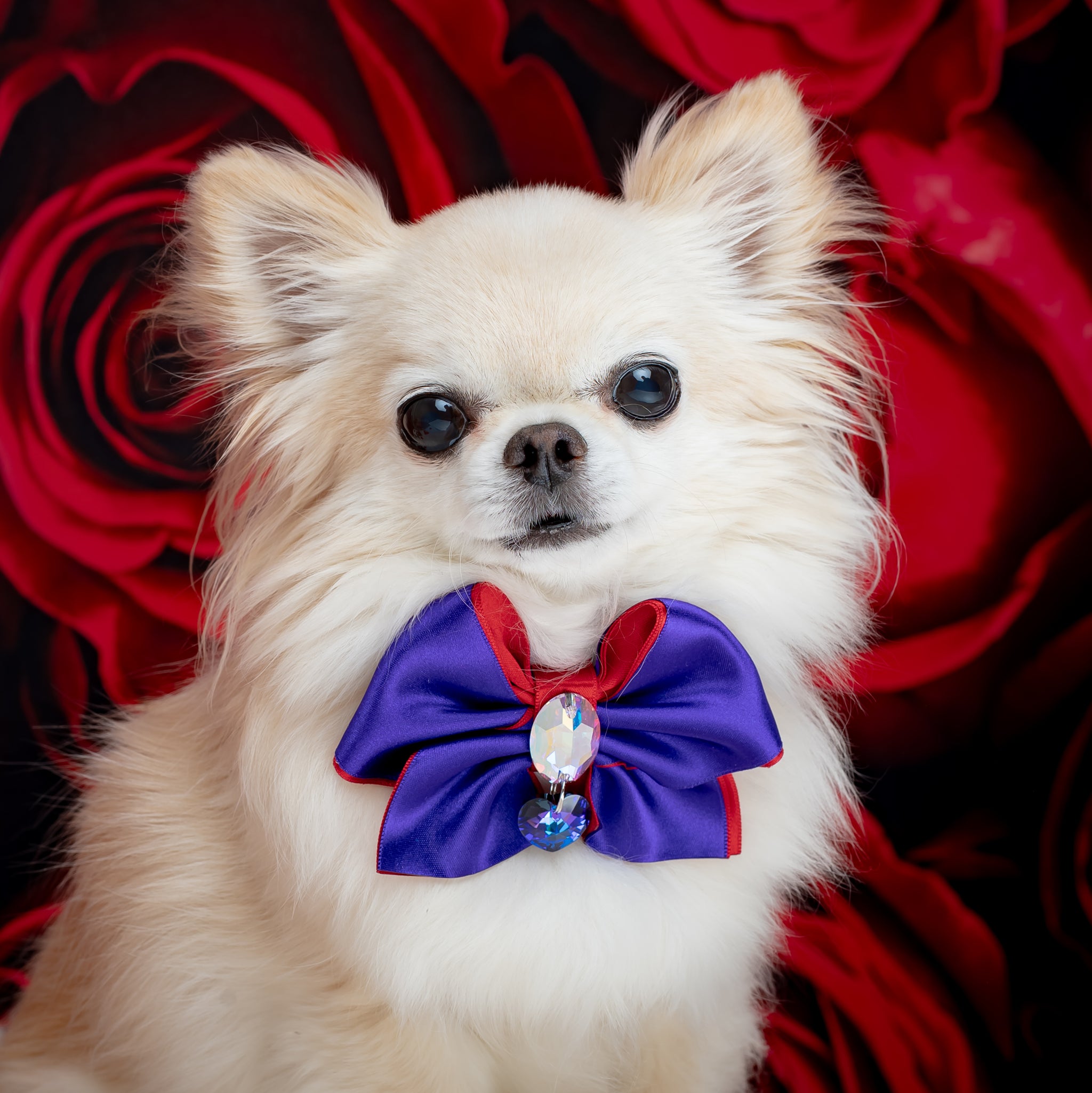 Our Furdrobe Violet Rose Clara petite dog bow is made from a gorgeous luxury satin. The outer satin is in a beautiful violet, whereas the inner bow is made with a striking red satin.