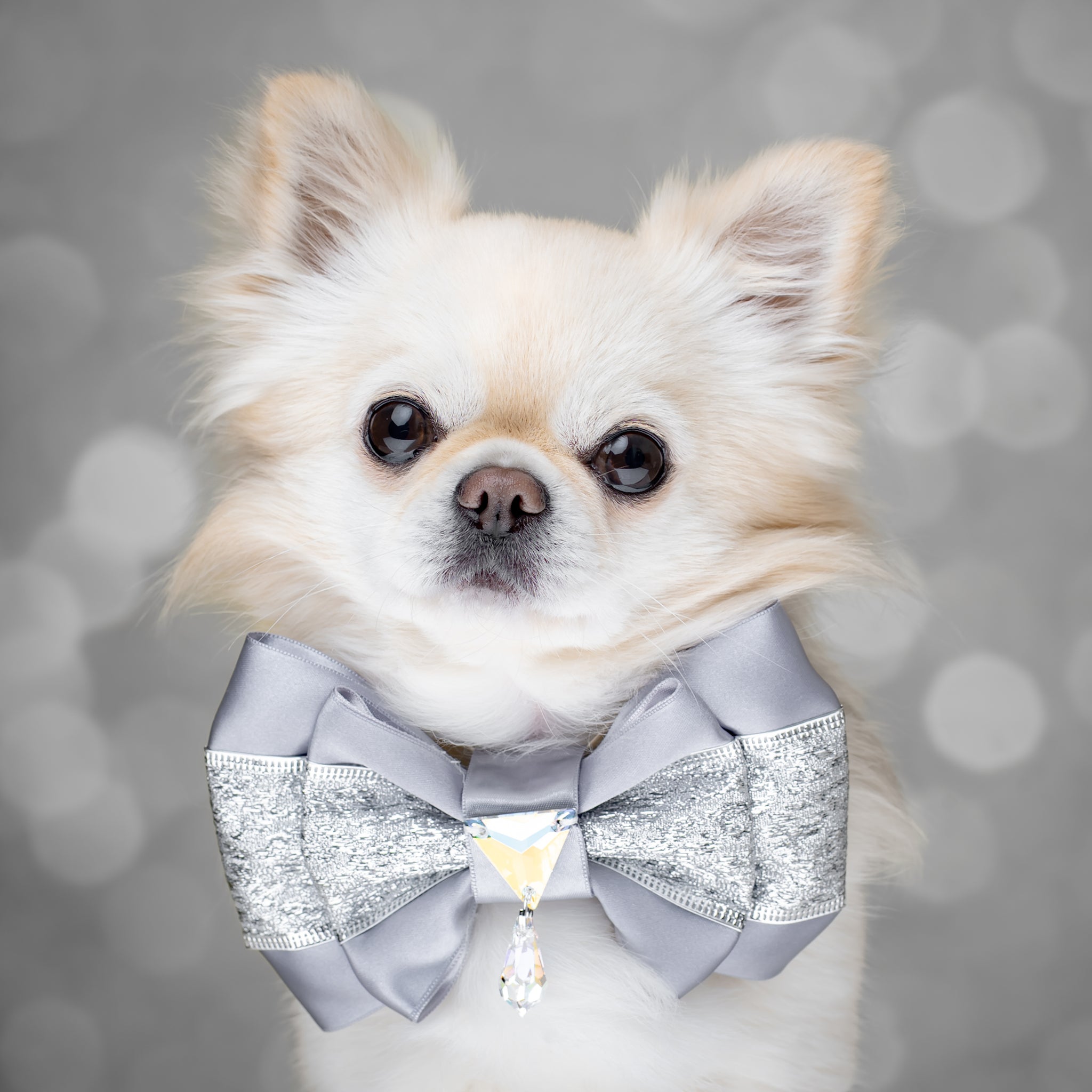 Our new Furdrobe Puppy Love bows have been made especially for our Silver Screen Collection. Created using an inner layer of lighter silver satin with a deeper silver satin on outside. Perfectly overlayed with a beautiful metallic silver with a textural pattern similar to a leopard print.